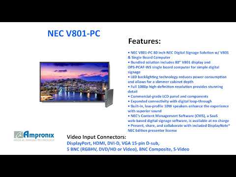 NEC’s Digital Signage Solutions provide a complete bundled product for customers that need a commercial-grade display and computer to source basic content. The NEC V801-PC bundle includes a 80” V801 display and OPS-PCAF-WS single board computer seamlessly integrated utilizing the expansion slot of the display. This built-in functionality allows for a clean, hidden integration while reducing the bill of materials needed for installation. NEC’s 80″ V801 commercial-grade large-screen LCD display is ideal for applications requiring a considerable screen size such as education facilities, coporate lobbies, board rooms, and retail. The integrated OPS-compliant computer boasts a 1.6 GHz Dual Core Atom CPU with 32GB solid state drive and Windows 7 Embedded.